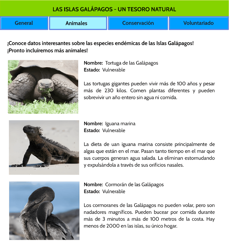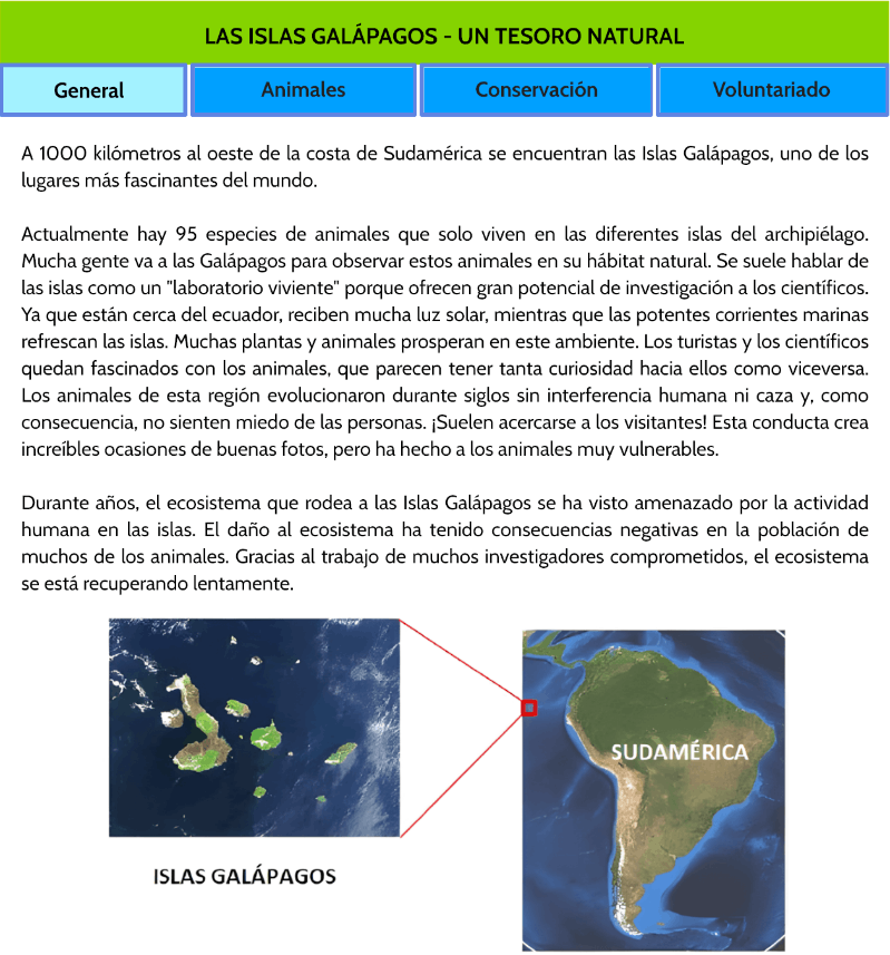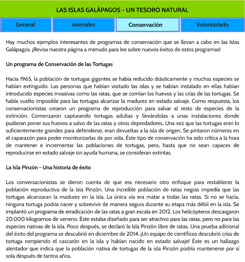 - Se presenta un sitio web sobre “Las Islas Galapagos”, con cuatro páginas, donde el estudiante debe buscar información para responder las preguntas.