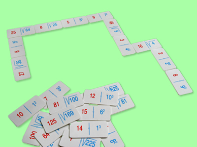 Descripción: Fichas de dominó hechas con cartón o madera que combinan operaciones de potenciación y radicación. En la escena