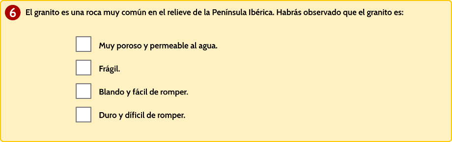 - La posibles respuestas se eligen entre cuatro propiedades del granito y cuatro que no lo son.