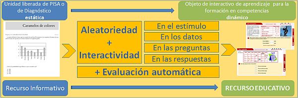 Las unidades liberadas de PISA o de las Pruebas de Evaluación de Diagnóstico no sólo son interesantes desde un punto de vista informativo de cómo se realizan esas pruebas, sino que pueden contemplarse y utilizarse como un importante recurso educativo en la formación competencial del alumnado. Pero esta posibilidad cuenta con una gran limitación dado su carácter estático que impide que un alumno en su formación pueda reutilizar una misma prueba, pues el recurso una vez resuelto queda inutilizado al conocerse tanto el planteamiento como la respuesta. Sin embargo aquí se aporta una alternativa a esa situación mediante la introducción de dinamismo en las unidades liberadas y así se consigue que un mismo alumno pueda reutilizar múltiples veces la misma unidad en su aprendizaje. Para ello es necesario que en cada acceso que se realice a una unidad se observe una exposición diferente en el estímulo y en las preguntas, que cuando aparezcan datos numéricos se vea cada vez una cuantificación distinta, que las repuestas alternativas que se ofrezcan cambien o permuten el orden de presentación, en definitiva conseguir que sea diferente el aspecto externo pero manteniendo la misma estructura y objetivo original. Lo que se produce es una reconversión de la unidad estática en una unidad dinámica.