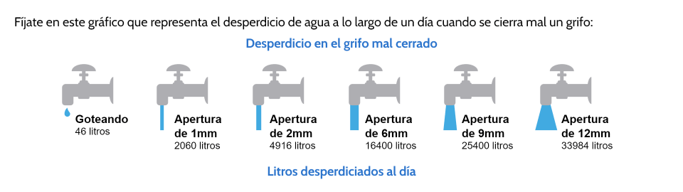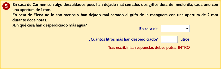 - Pregunta abierta. A la vista de los datos que varían tanto en la apertura del grifo mal cerrado como en el tiempo que han permanecido así, deben decidir en cuál de las dos situaciones presentadas se ha desperdiciado más agua y calcular cuánta más.