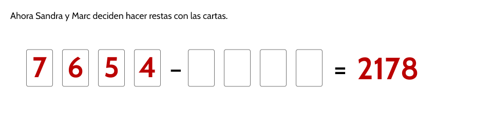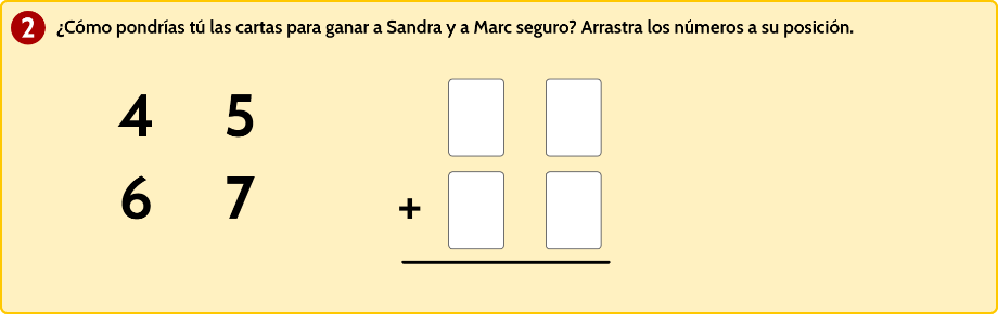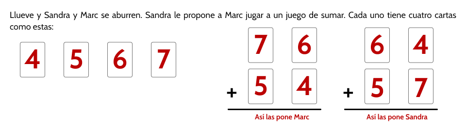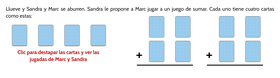 - Independientemente de los números que escondan las cartas ganará aleatoriamente Marc o Sandra pues dichos números se colocan, siguiendo el mismo patrón, aleatoriamente a uno u otro jugador.