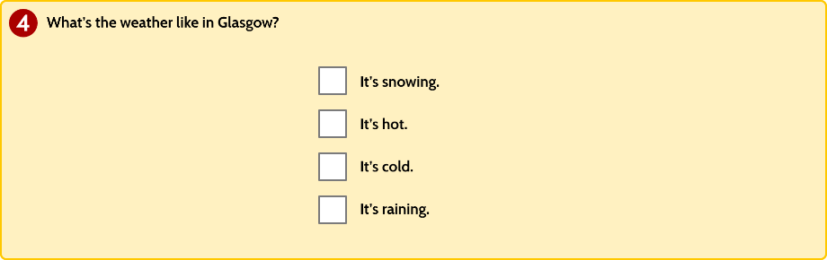 - El tiempo en la ciudad donde vive Jane varía entre las cuatro posibles respuestas, con lo que la correcta cambiará en cada ocasión.