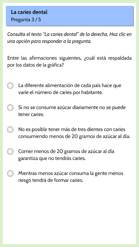 Partiendo de información científica y de datos estadísticos recogidos sobre diferentes países, se pretende conocer la competencia que se tiene sobre la caries dental en un contexto de salud personal o social.