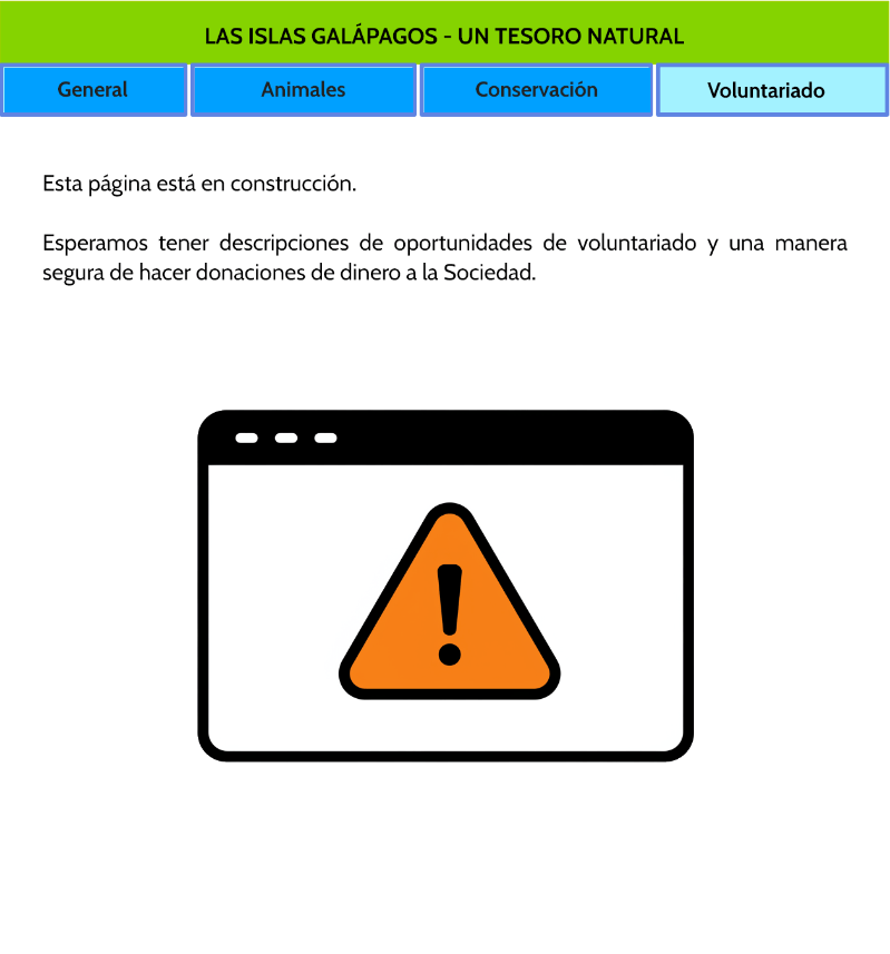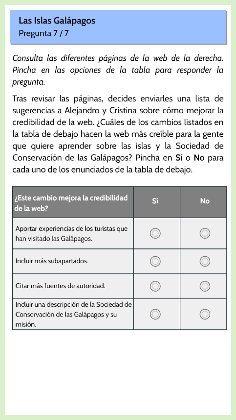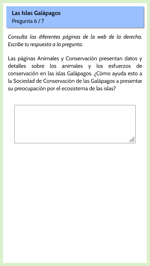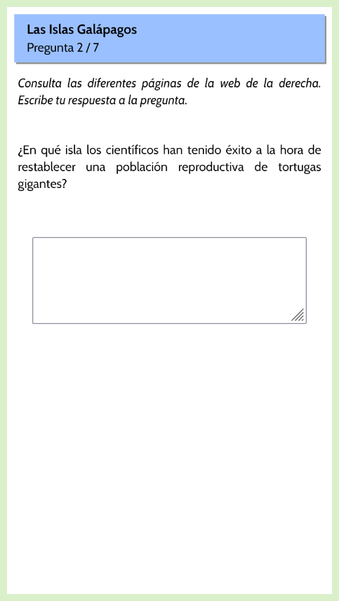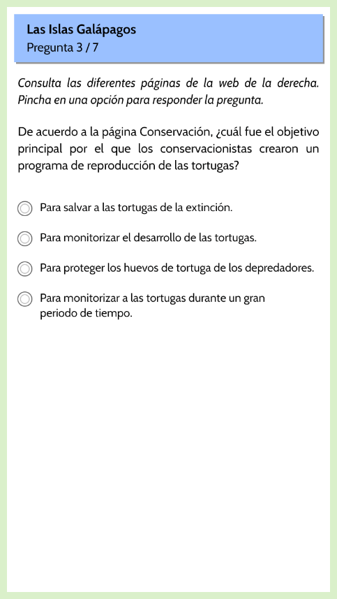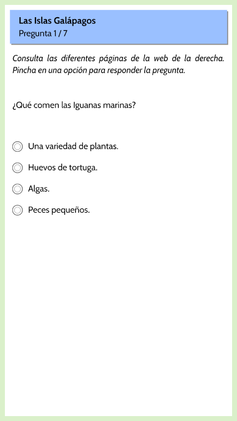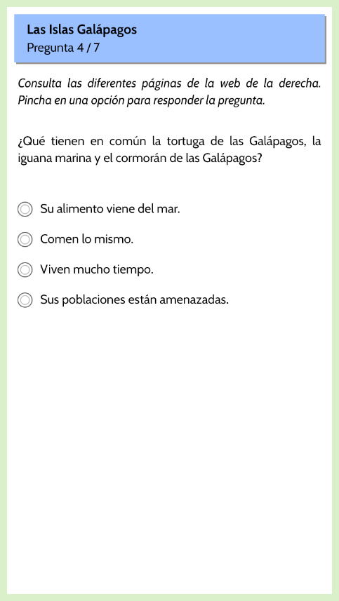 - Se presenta un sitio web sobre “Las Islas Galapagos”, con cuatro páginas, donde el estudiante debe buscar información para responder las preguntas.