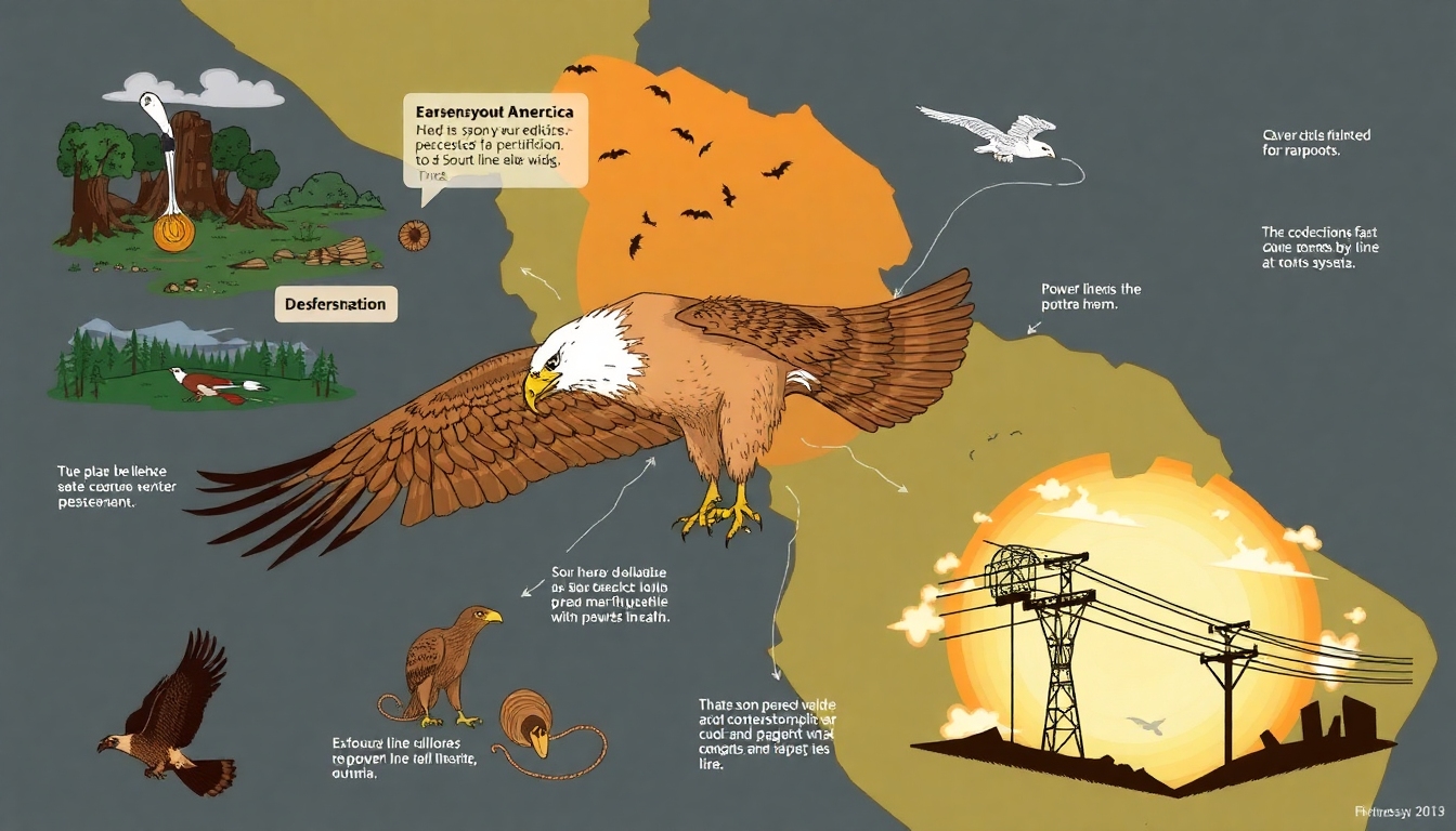 Las aves rapaces de Sudamérica enfrentan numerosas amenazas que ponen en peligro su supervivencia. La pérdida y fragmentación del hábitat, debido a la deforestación, la expansión agrícola y la urbanización, son las principales causas de su declive. La conversión de bosques y pastizales en tierras de cultivo o pastoreo reduce la disponibilidad de presas y sitios de anidación. El envenenamiento, tanto intencional como accidental, es otra amenaza importante. El uso de pesticidas y rodenticidas en la agricultura puede contaminar a las presas de las aves rapaces, provocando su muerte. La caza furtiva, motivada por el temor a que las aves rapaces ataquen al ganado o por la simple búsqueda de trofeos, también contribuye a su declive.