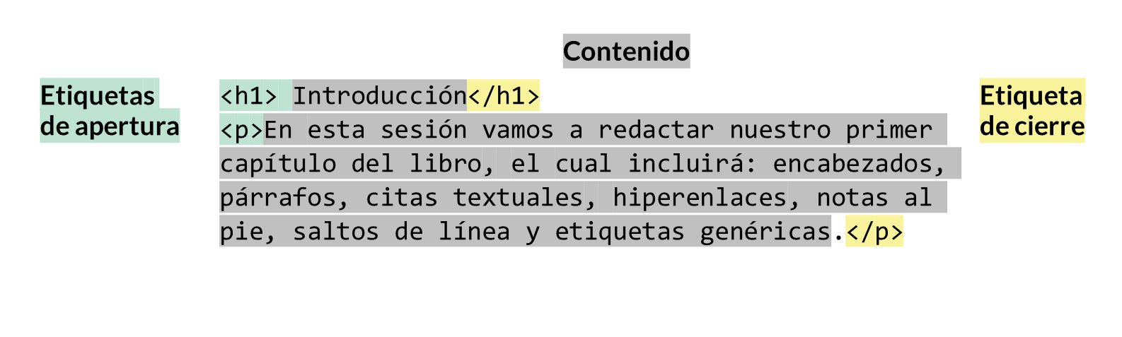 Se escriben entre corchetes angulares < >, generalmente tienen una apertura y cierre y el contenido está entre ellas.