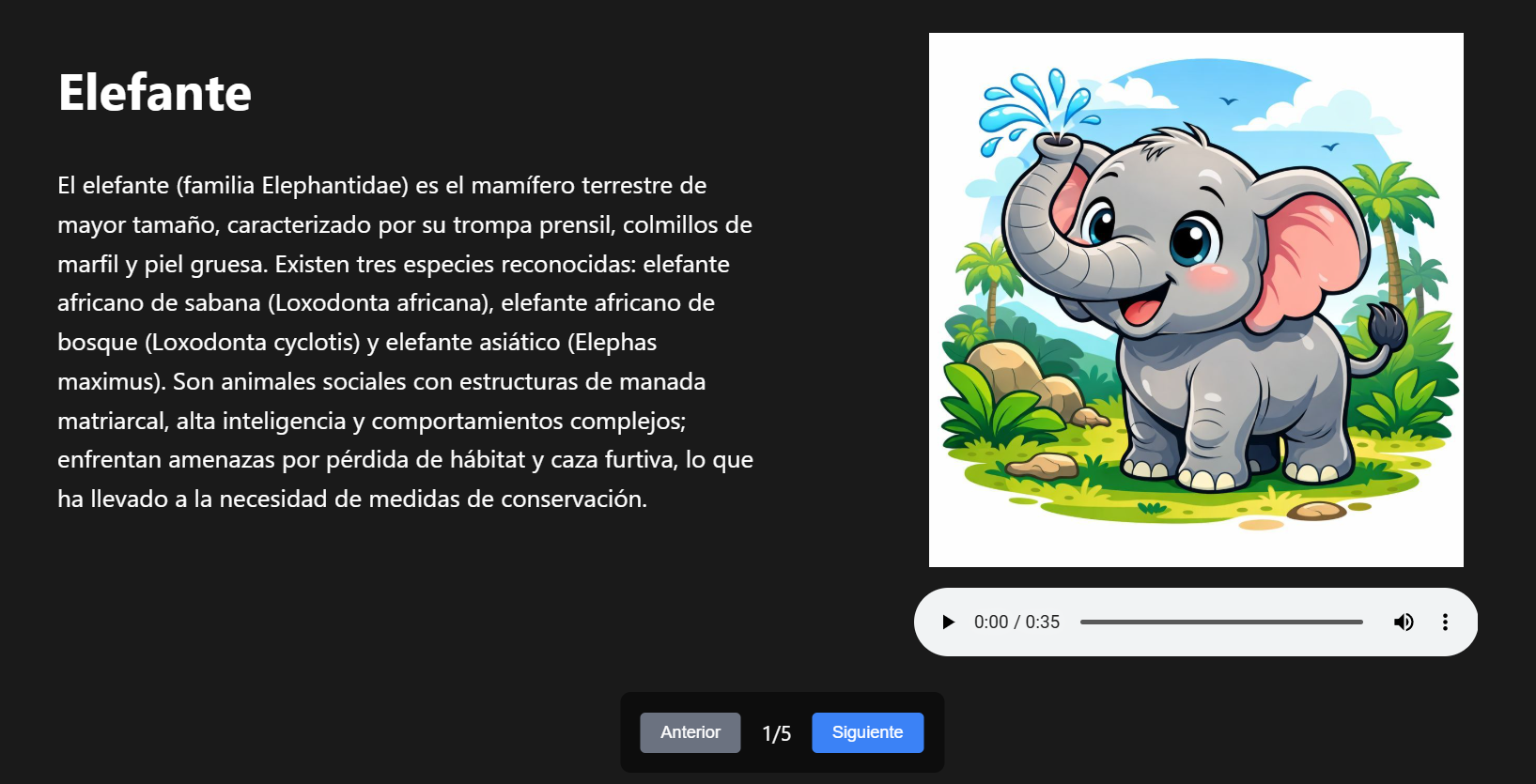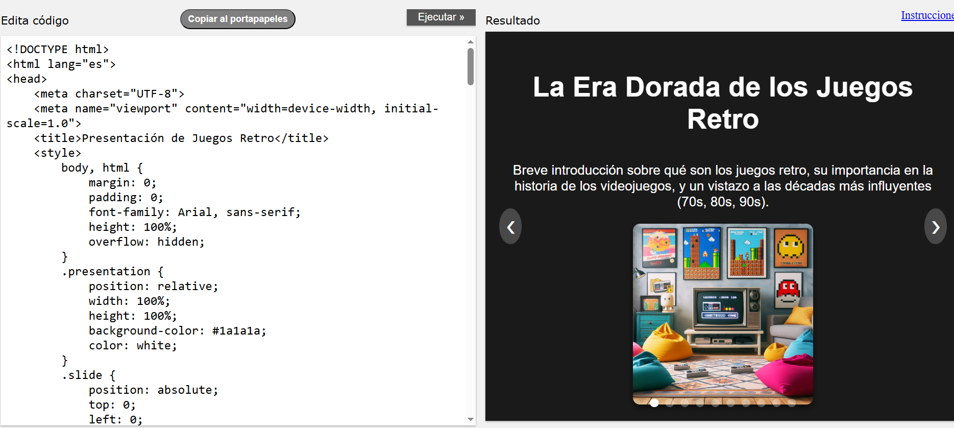 En el libro anterior se presentan algunas limitaciones, como el tamaño fijo de las imágenes. Limitaciones que han sido superadas con el uso de la inteligencia artificial. Publicamos, entonces, el libro Plantillas para libros con inteligencia artificial que, además de permitir imágenes de cualquier tamaño, mejora el diseño de algunos objetos interactivos; por ejemplo, la presentación interactiva de la página siguiente, a diferencia de las obtenidas anteriormente, incluye animaciones y barra de puntos de progreso; obviamente, las IA usadas en el apartado 7.2 seguramente también pueden hacerlo, con unas buenas indicaciones.