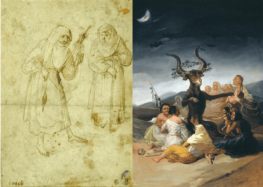 Francisco de Goya ocupa el primer plano de esta historia visual. Obras como El aquelarre (también conocido como El gran cabrón) y la serie de grabados Los Caprichos transformaron la tradición iconográfica de la bruja: la convirtieron en figura de sátira social y de crítica a la superstición, pero al mismo tiempo en un personaje terrorífico y fascinante. Goya reinventa la atmósfera mediante composiciones nocturnas, grotescos deformados y un manejo dramático del claroscuro que subraya la mezcla de horror y humor. Sus imágenes fijaron en la imaginación colectiva elementos que reaparecerán en siglos posteriores: la circulación de animales nocturnos, la distorsión de la figura humana y la sensación de un rito clandestino que cuestiona la moral oficial.