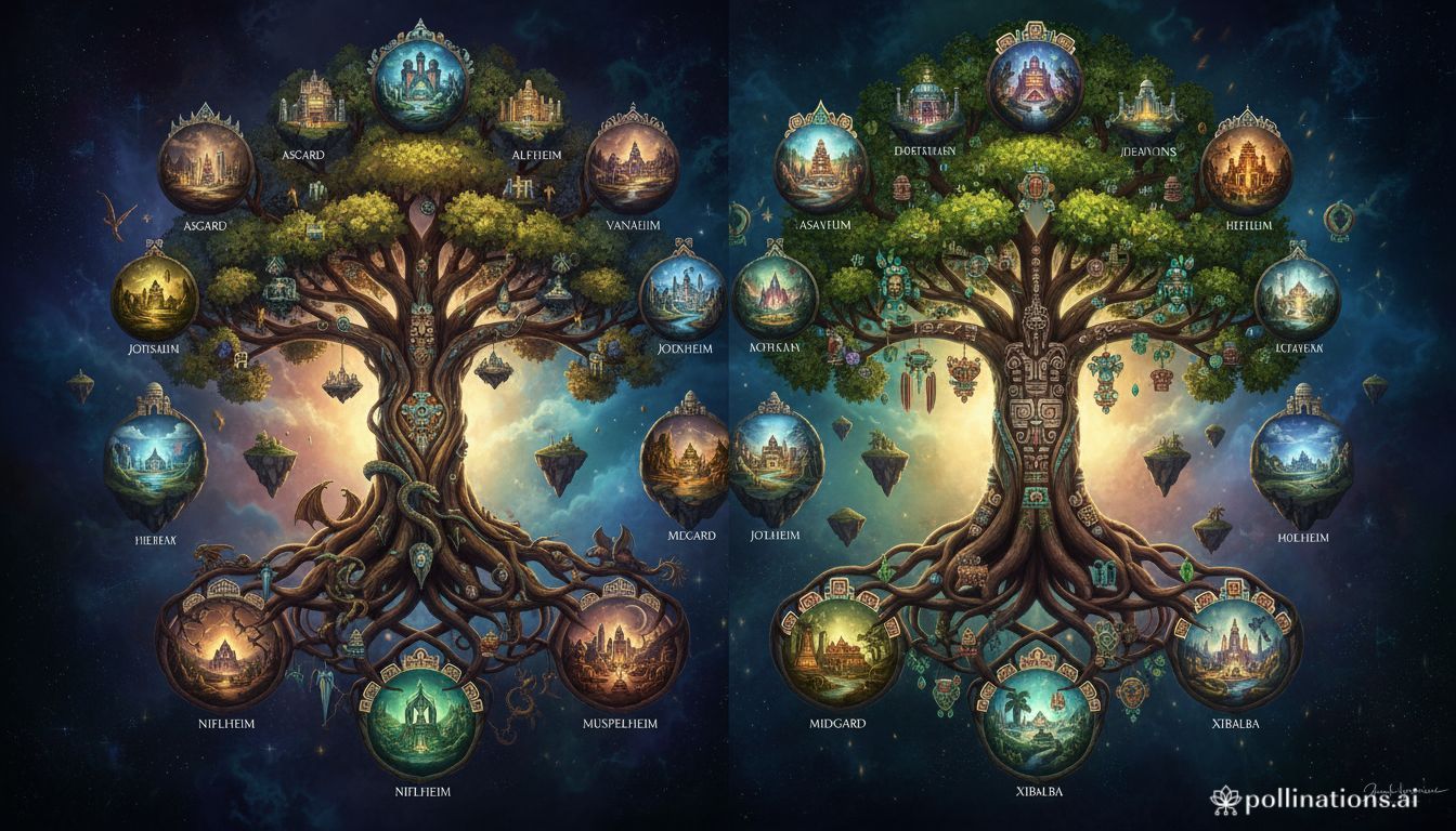Nórdicos: Yggdrasil, el fresno inmenso que sostiene los nueve mundos. Sus raíces van al inframundo, su tronco es Midgard (nosotros) y sus ramas tocan el cielo.