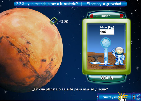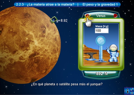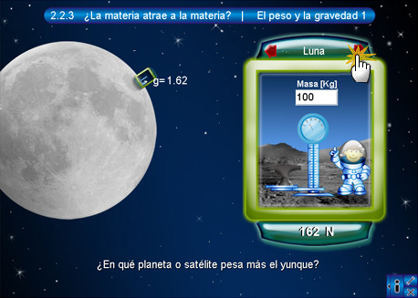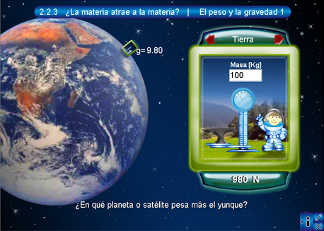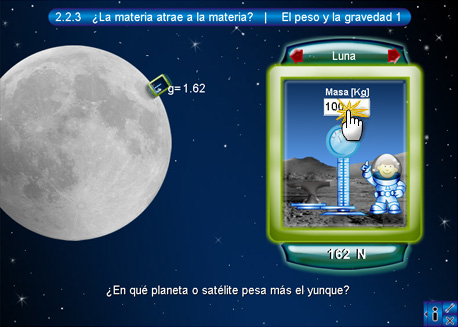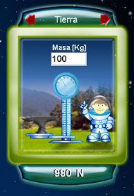 En esta pantalla se muestra una cápsula espacial dentro de la cual se encuentra un niño astronuauta con una báscula y un yunque colocados sobre una superficie, la cual corresponde a la de algún planeta de los que se encuentran dibujados a la izquierda. De manera predeterminada, el niño está colocado sobre la superficie de la Tierra. La cápsula cuenta además con una serie de botones y de textos en la parte superior e inferior. Los superiores (de color rojo) son botones de desplazamiento entre los planetas o satélites, en el centro de estos dos botones se encuentra el nombre del planeta activo. El objetivo de esta escena es que el alumno ingrese la masa (en kilogramos) del yunque para lo cual se tendrá que teclear en el cuadro de texto y presionar intro. En la parte inferior hay un texto con el resultado del peso o la fuerza del objeto en los diferentes planetas. Los dos pulsadores de color verde sirven para cambiar de unidades el resultado, ya sean Kg o N.
