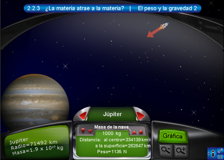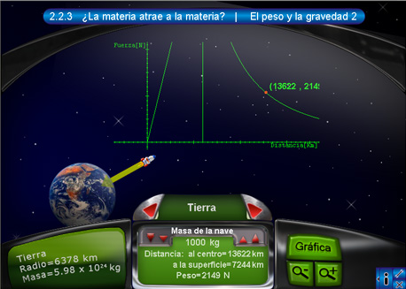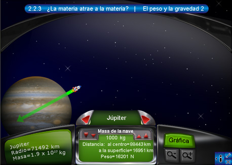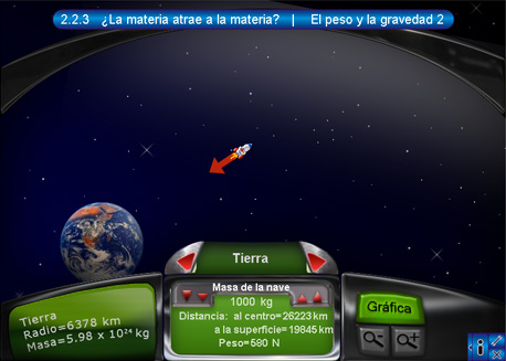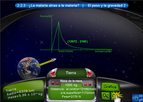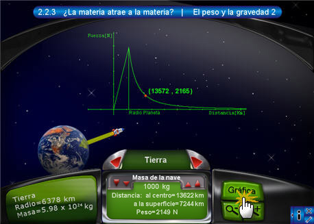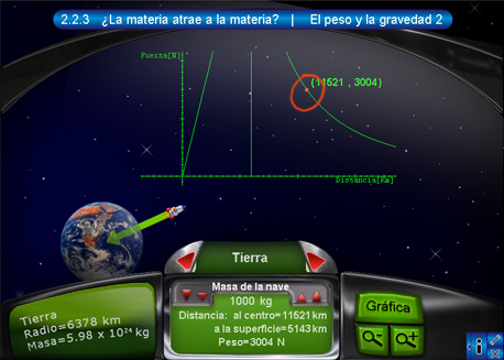2. El peso y la gravedad 2En la segunda escena se observa el tablero con la información de la nave que se encuentra sobre determinado cuerpo celeste. Esta información consta del nombre del cuerpo activo, la distancia hacia el centro del cuerpo, la masa de la nave y la fuerza con la que el planeta atrae a la nave. Oprimiendo el botón "Gráfica" del lado derecho del tablero, se despliega la gráfica de distancia contra fuerza. Los dos botones rojos de desplazamiento sirven para cambiar de cuerpo celeste.