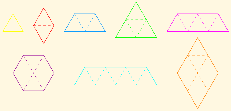 El tangram triangular es un rompecabezas compuesto por ocho piezas. Cada pieza se obtiene uniendo desde uno hasta ocho triángulos equiláteros. A continuación se representan las ocho piezas, con los mismos colores que aparecen en la escena, divididas en triángulos equilateros.