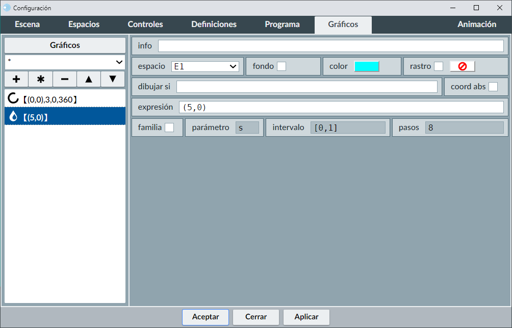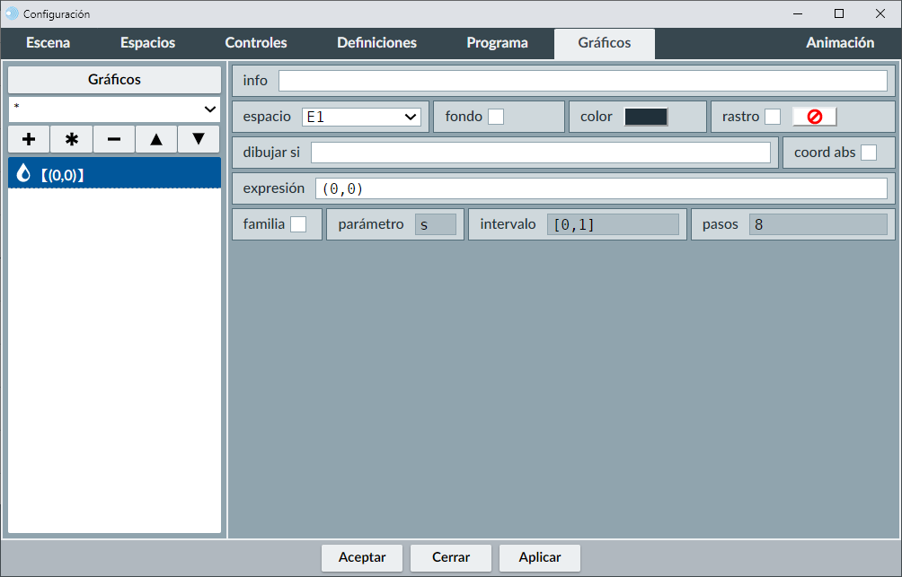 Un relleno se define únicamente mediante un punto y un color. El punto funciona como la semilla o punto inicial de un proceso de relleno o coloreo, que llena, con el color seleccionado, la región cerrada dentro de la cual se encuentra el punto. Los gráficos que son de fondo no cuentan como fronteras para el relleno, a menos que el relleno mismo sea de fondo. En definitiva, el punto del relleno coloreará todo espacio cerrado alrededor de dicho punto. El panel de configuración específico del tipo relleno tiene este aspecto: