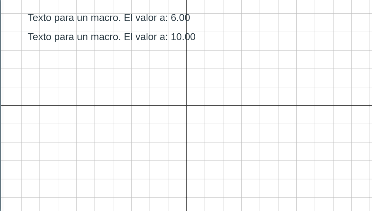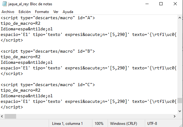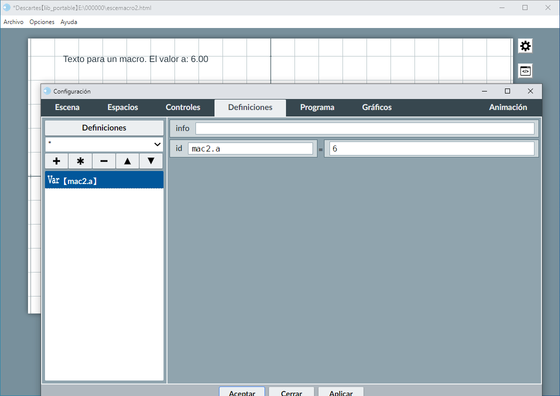 Nota importante. Cuando se usan las escenas de Descartes en el equipo local, para que los macros funcionen, se deben añadir al final del código de la escena, entre las etiquetas . Si en el editor de escenas de Descartes está marcada la opción "macro" del submenú "Agregar al html" del menú "Opciones", el código del mismo se añadirá automáticamente al final del código de la escena. A continuación, vemos un ejemplo de tres macros añadidos al final de una escena de un juego.