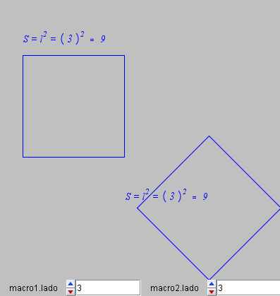 b) Desde la escena se puede modificar el valor de una variable del macro, llamándola de la siguiente forma: nombre del macro.nombre de la variable. En nuestro ejemplo, es macro1.lado (para variar el valor de lado del macro 1) y macro2.lado (para variar el valor de lado del macro 2. De esta forma el valor de la variable lado del macro1 será igual que el de la variable de la escena que lo llama macro1.lado y el valor de la variable lado del macro2 será igual que el de la variable de la escena que lo llama macro2.lado.