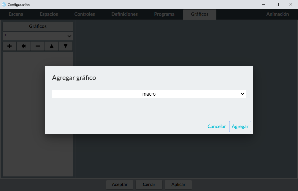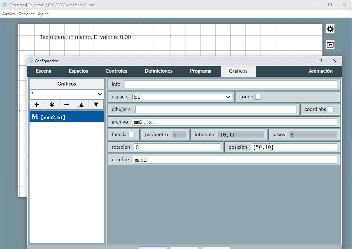 Paso 4. Pasamos a introducir el macro en la escena. Gráficos, en el menú de la izquierda pulsamos + (añadir) y en la ventanita seleccionamos macro. El macro es mm2.txt y el nombre que le daremos al macro en la escena es mac2.