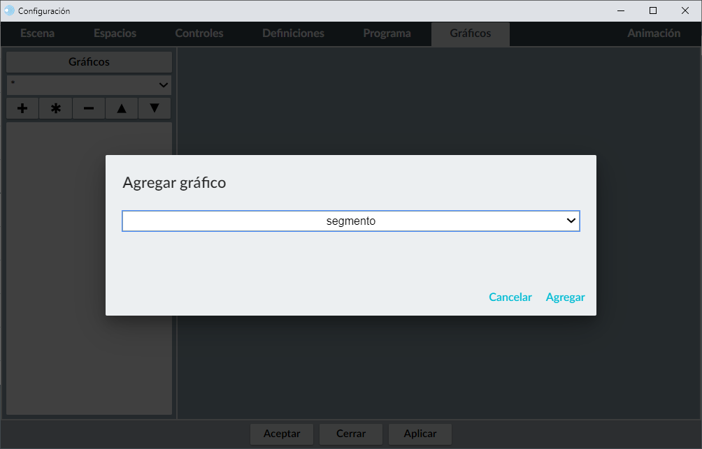 Si en el menú de selección que hay encima de la etiqueta azul gráficos se selecciona algún espacio se mostrarán sólo los gráficos correspondientes a ese espacio, si se selecciona * se muestran todos los gráficos de esa escena.