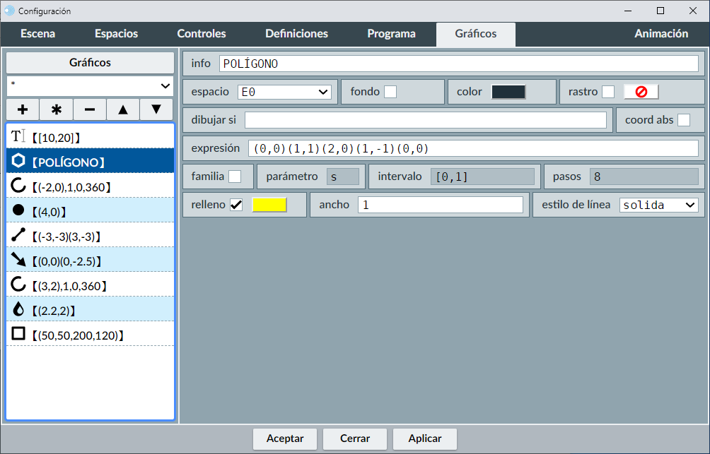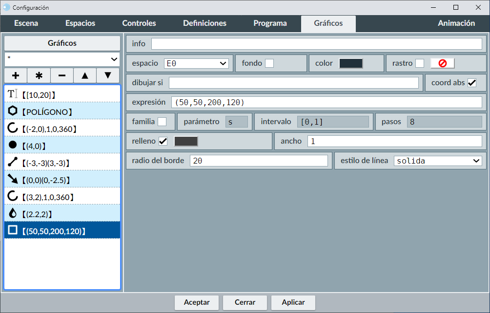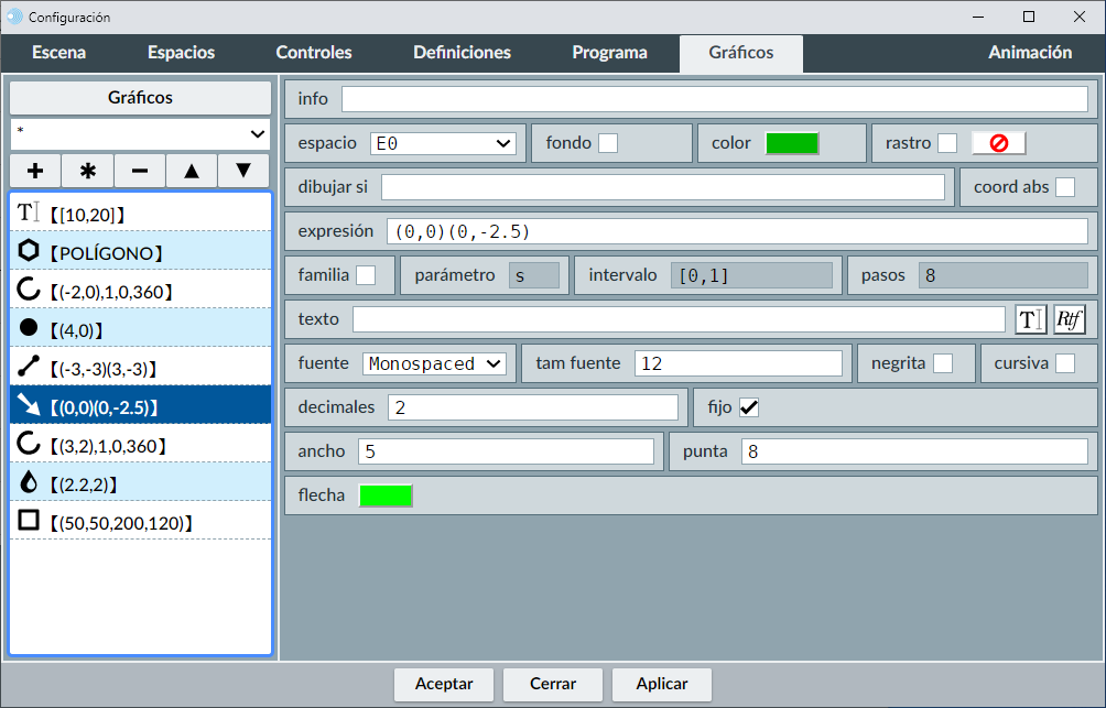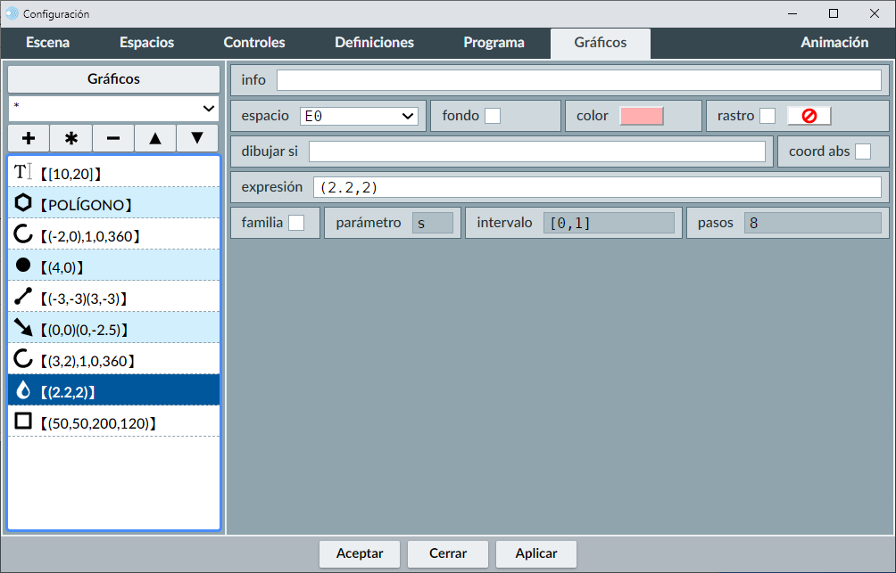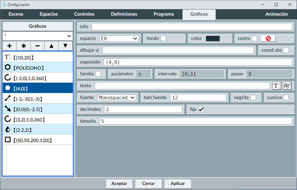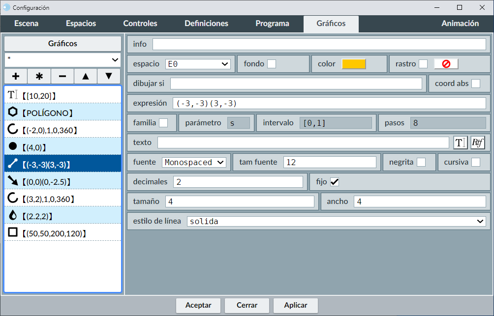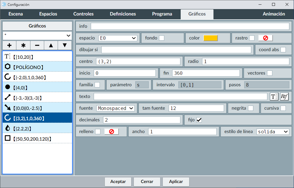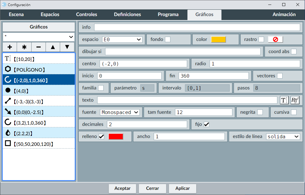 A la izquierda aparece la lista de todos los gráficos de la escena (menú de selección de gráficos). A la derecha veremos un panel (que será diferente para cada tipo de gráfico) en el que se pueden editar todos los parámetros que definen al objeto gráfico seleccionado en la lista.