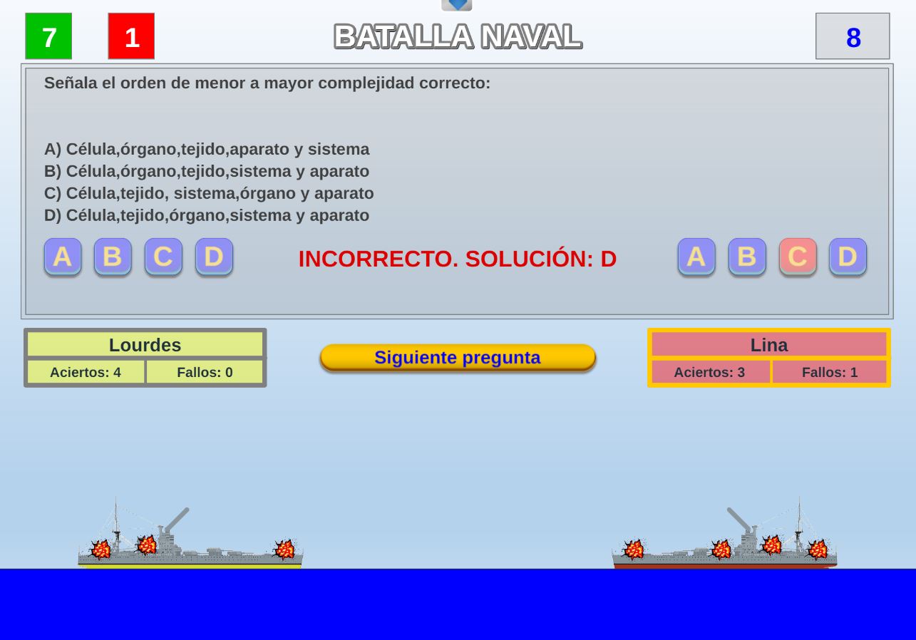En esta actividad dos jugadores o normalmente dos equipos, cada uno representado por un barco, participan por turnos, estableciéndose por sorteo el que comienza. A cada participante se le planteará un máximo de diez preguntas. Tras cada pregunta el cañón del barco que tiene el turno disparará una bomba que hará blanco en el barco rival si la pregunta ha sido respondida correctamente y fallará en caso contrario. El barco que reciba cinco impactos se hundirá.