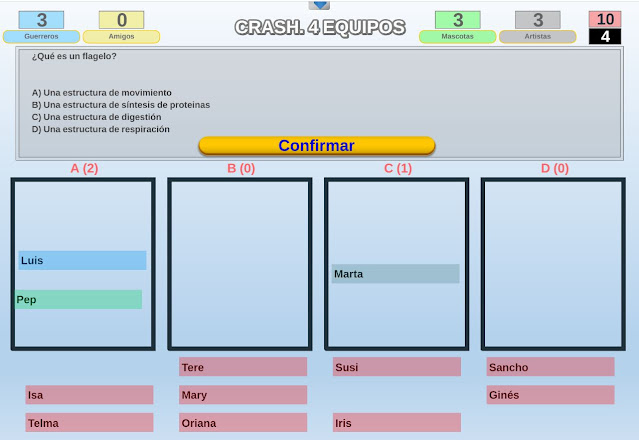 Tras formularse cada cuestión, todos los alumnos, de forma independiente, deberán marcar mediante sus tarjetas de respuesta la opción elegida. Esto hará que los participantes se ubiquen en uno de los 4 contenedores existentes en el juego.