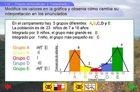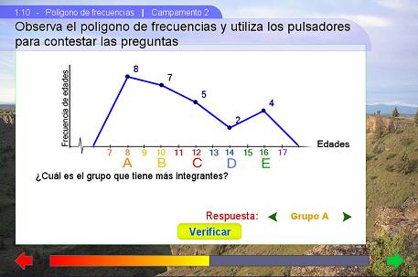 ocultar tanto el histograma como el polígono de frecuencias. Campamento 2La segunda escena muestra el polígono de frecuencias de las edades del grupo de niños. Con fines de evaluación se presentan varias preguntas que deben contestarse eligiendo una opción del menú que se encuentra debajo del texto de la pregunta, para ver las opciones basta presionar cualquiera de las dos flechas verdes que se encuentran al lado derecho de la palabra "Respuesta". Para verificar si la respuesta es correcta presione el botón Verificar.