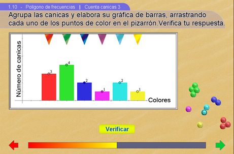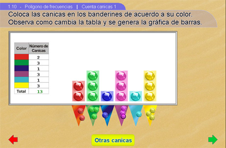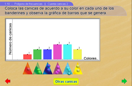 1. Cuenta canicasEste apartado consta de tres escenas. Cuenta canicas 1Es una escena introductoria a la construcción de gráficas de barras, se trata de agrupar un conjunto de canicas de acuerdo a su color. Con esto se logra que el alumno se familiarice con las gráficas de barras y de manera intuitiva capte la información que ellas ofrecen. La escena muestra como al agrupar las canicas por colores, éstas se apilan generando una gráfica de barras. Al terminar de colocar todas las canicas se puede presionar el botón Otras canicas para reiniciar la escena con otro grupo de canicas. . Cuenta canicas 2Funciona de manera similar a la anterior, pero aquí ya se muestran los ejes coordenados y las canicas apiladas cambian por la gráfica de barras “formal”. Al terminar de agrupar las canicas, presionando el botón Otras canicas se puede reiniciar la escena y repetir el ejercicio con otro grupo de 13 canicas Cuenta canicas 3La tercera escena es de evaluación, permite elaborar la gráfica de barras contando cuántas canicas hay de cada color. Los puntos de color que se encuentran en el pizarrón se deben arrastrar hacia arriba hasta que aparezca el número correspondiente a la cantidad de canicas de dicho color. Al terminar de elaborar la gráfica, con el botón Verificar se puede saber si el ejercicio se resolvió correctamente.