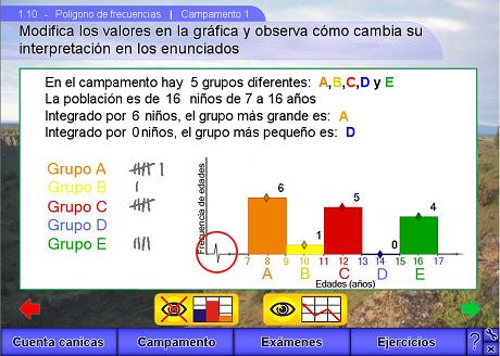 Sugerencias didácticasEs importante hacer notar a los alumnos las características de las gráficas de barras para evitar que posteriormente las confundan con los histogramas. En el caso de variables nominales o cualitativas (características como: sexo, color, nacionalidad, etcétera ) se usan gráficas de barras, pues este tipo de gráficas permite espaciamientos entre las barras y no requiere de una escala ordinal en el eje horizontal. Por ejemplo, en este ejercicio el hecho de que el color amarillo esté a la derecha de los otros no significa que sea mayor que ellos y la distancia entre las barras tampoco representa diferencias entre los colores, las barras podrían haberse colocado a una distancia mayor o menor sin que ello afectara la gráfica. Sobre las gráficas de barras no deben construirse polígonos de frecuencias. 2. CampamentoEste apartado consta de dos escenas. Campamento 1Es una escena de exploración que sirve de introducción a la construcción de histogramas y polígonos de frecuencias. El objetivo es que el alumno entienda e interprete la información proporcionada por el polígono de frecuencias de las edades (que se construye sobre el histograma de frecuencias de las edades). La situación planteada se desarrolla en un campamento de verano para niños y jóvenes. Las edades de los campistas (en años cumplidos) van de 7 a 16. Los organizadores del campamento han decidido formar cinco clases o grupos (A, B, C, D y E) de acuerdo a las edades. En el grupo A quedan los niños de 7 y 8 años cumplidos, en el B los de 9 y 10, y así sucesivamente hasta el grupo E de los más grandes, en donde están los jóvenes de 15 y 16. Como se mencionó en el párrafo anterior, esta escena sirve como una introducción a los histogramas, a diferencia de la escena anterior aquí hay una escala ordinal en las edades y no hay espaciamiento entre las barras. Éstas son las diferencias principales entre una gráfica de barras y un histograma. Aquí la clase B debe estar a la derecha de la clase A pues los niños son mayores en el grupo B, mientras que en el caso de los colores de las canicas el orden de las clases pudo haber sido otro. El alumno puede modificar la