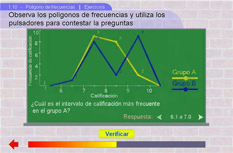 Sugerencias didácticasEs importante hacer reflexionar a los alumnos sobre la manera de construir las clases o intervalos. Cualquier número que esté en el rango de los datos (que sea mayor o igual que el mínimo y menor o igual que el máximo) debe quedar forzosamente en alguna de las clases definidas. Por ello no debe haber espaciamiento entre las barras. 4. EjerciciosEsta escena es de carácter evaluativo, en ella se muestran los polígonos de frecuencias de las calificaciones de dos grupos de estudiantes (Grupo A y Grupo B) con el mismo número de alumnos. En la parte inferior se presentan, una a una, preguntas que el alumno debe responder eligiendo alguna de las opciones que se presentan en el menú. Para ver estas opciones basta presionar cualquiera de las flechas blancas que están a la derecha de la palabra "Respuesta". Para evaluar la respuesta se usa el botón Verificar.