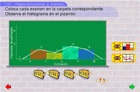 Sugerencias didácticasTrate de enfatizar las diferencias entre una gráfica de barras y un histograma. Un histograma es una gráfica de barras verticales sin espaciamiento entre ellas, que se construye colocando en el eje vertical a las frecuencias relativas o absolutas y en el eje horizontal a los límites de clase. Un polígono de frecuencias se construye uniendo con líneas rectas los puntos medios de la cara superior de los rectángulos (barras) de un histograma. Deje claro al alumno que sólo tiene sentido construir un polígono de frecuencias cuando en el eje horizontal hay una escala ordinal, de otro modo la forma del polígono no proporciona información pues el orden en que se colocaron las barras pudo haber sido diferente. Hágales notar también que en este caso, debido a que la edad se mide en años cumplidos, no hay problema para decidir en que grupo queda cada niño, sin embargo esto no ocurre siempre. En algunas ocasiones el valor de la característica que nos interesa coincide con el límite de alguna de las clases, en esos casos es necesario definir las clases o intervalos de forma que no se presenten ambigüedades. En el siguiente apartado se resaltará este problema. Puede usar este apartado para ir familiarizando a los alumnos con las medidas de tendencia central (media, moda y mediana) que se verán posteriormente en la Unidad 1.7. Puede hacerles notar que hay barras más grandes que otras (relación con la moda), que con ayuda del polígono pueden tener una idea de cual es el valor de la mediana (contar el número de datos y localizar el dato o los datos centrales) y de que la forma del polígono también ayuda a estimar el valor de la media. ObservacionesEl símbolo que está en el círculo rojo de la siguiente imagen se usa con mucha frecuencia en los histogramas, y en muchas otras gráficas, para indicar que la escala está "encogida" a la izquierda y el tamaño de las unidades de medición no es el mismo que a la derecha, esto se hace principalmente por razones de espacio. Si se escribieran los números que faltan en el eje horizontal (desde el cero hasta el 6) el histograma quedaría demasiado alejado del eje vertical donde se miden las frecuencias. 3. ExámenesAquí un profesor quiere obtener, mediante un examen, alguna información sobre el desempeño de su grupo de 13 alumnos. La información obtenida será mostrada en el pizarrón mediante el polígono de frecuencias de calificaciones. El profesor pide ayuda a sus alumnos para clasificar los exámenes en diferentes grupos, de acuerdo a las calificaciones. Como todos los exámenes son aprobatorios y las calificaciones van de 6.1 a 10, el profesor decide formar las siguientes 4 clases (o intervalos): (6, 7], (7, 8], (8, 9] y (9, 10] donde la notación (a,b] con a < b, indica que pertenecen a esa clase todas las calificaciones estrictamente mayores que a pero menores o iguales que b. Con las clases así definidas un examen con calificación 7.0 queda en el primer grupo y uno con 7.1 en el segundo. No hay ambigüedad ni problemas de clasificación aún cuando se presenten valores que coincidan con los límites de clase. Para clasificar los exámenes se debe arrastrar cada uno de ellos a la carpeta que le corresponde, si esto se hace bien, el examen cambiará de tamaño (se reducirá) y quedará dentro de la carpeta, además se agregará una unidad a la barra correspondiente en el histograma, lo que se verá reflejado en un incremento en el tamaño de dicha barra. Los dos botones colocados del lado derecho permiten mostrar u ocultar tanto el histograma como el polígono de frecuencias. Al terminar de agrupar los exámenes, aparecerá el botón Otros exámenes que permite reiniciar el ejercicio con otro grupo de exámenes.