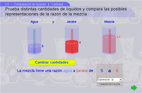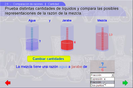 1. CantidadEl objetivo de esta escena es mostrar el uso del concepto de razón y sus diferentes representaciones mediante un ejemplo real, en este caso, la mezcla de dos líquidos: agua y jarabe. La escena muestra a la izquierda dos recipientes de igual capacidad, los cuales son usados para medir la proporción de líquidos a usar (agua y jarabe de frutas) para preparar una bebida refrescante. A la derecha se muestra el envase donde tiene lugar la mezcla. Cada vez que el botón "Cambiar cantidades" es pulsado, el interactivo genera aleatoriamente nuevos valores para ambos líquidos. En la parte inferior un enunciado indica la relación obtenida y dentro del cuadro su representacion. Con la flecha se pueden mostrar las diferentes representaciones de la relación de mezcla.