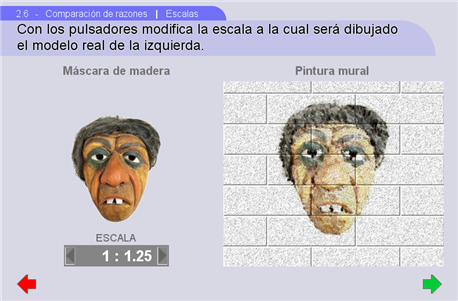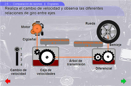 2. EscalasUno de los usos prácticos del concepto de razón y su representación con dos puntos”:” son los modelos a escala de objetos reales. En este ejemplo, a partir de una máscara de madera de tamaño real, se reproduce su imagen en una pintura mural de tamaño proporcional al indicado por el control de escala. Accionando el control de escala se obtienen reproducciones del original que van de 1/4 hasta 2.25 veces del tamaño original. La razón de números dentro del cuadro gris indica la relación de medidas entre el original y su reproducción. 3. EngranesLas cajas y juegos de engranes son otro ejemplo muy común donde se aplica el concepto de razón. El par motriz generado por un motor de combustión rara vez es aplicado directamente a la carga mecánica. El uso de engranajes con razones bien definidas contribuyen a multiplicar el torque de salida de éstos motores y por lo tanto, la fuerza final aplicada a la carga. El