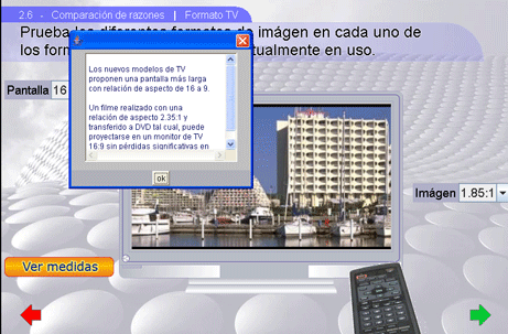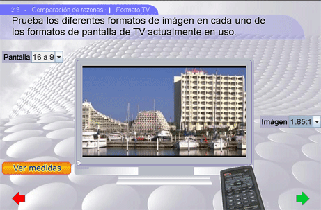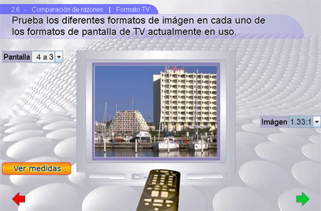 en el recuadro por arriba de la caja. Cabe señalar un efecto óptico muy interesante, que se puede apreciar en el tercer engrane, contando de izquierda a derecha; éste efecto es el siguiente: Primero, es un hecho que si cambiamos la velocidad a cuarta, la velocidad angular del tercer engrane debe ser idéntica a la del segundo engrane, lo cuál podemos apreciarlo al contar el número de giros totales (de 360°) que el punto blanco del tercer engrane, hace por unidad de tiempo. Si comparamos éste número con el del segundo engrane, veremos que son iguales. Sin embargo el efecto óptico del tercer engrane, nos hace ver que las ranuras de color negro del engrane giran en sentido contrario a las agujas del reloj, siendo que el punto blanco de éste gira en el sentido de las agujas del reloj. Este efecto podemos verlo en las hélices de los aviones o de los helicópteros, incluso en las llantas de los autos cuando éstos últimos van a mucha velocidad, en estos ejemplos podemos notar como al ir ganando velocidad de giro, la percepción visual es que comienzan a girar en sentido contrario al inicial. Hacemos esta observación con el único fin de aclarar este efecto óptico. Por eso es importante no perder de vista a los puntos blancos de los respectivos engranes, ya que nos servirán cono una correcta referencia visula para indicarnos la dirección real de rotación y la velocidad angular. Para que éstos puntos blancos se vieran rotar en sentido inverso al correcto, necesitaría girar con una tremenda velocidad angular y en ninguno de los casos del interactivo esa velocidad llega a ser tal. 4. Formatos de TVLos filmes y programas televisivos producidos en todo el mundo cumplen con ciertas especificaciones para poder ser proyectados sin merma en una pantalla de cine o monitor de TV. Una de estas especificaciones hace referencia al tamaño de la pantalla de proyección: su relación ancho-alto. Actualmente, el formato 4 a 3 es el más difundido en los equipos receptores de TV. Con la introducción de formatos de alta definición y la transcripción de filmes al popular formato DVD, es posible conservar la relación original , más larga que el formato de TV nativo. Por esta razón, la creación de un formato de monitor de TV más ancho está siendo difundida con fuerza por la industria. Las razones se obvian con este ejemplo. Con el control de Pantalla cambia entre formato normal y ancho; con el control de Imagen cambia el origen de la señal y su formato nativo. Realizando diferentes combinaciones puede notarse las ventajas y/o desventajas de ambos formatos. El control Ver medidas permite ver y comparar las distintas medidas involucradas en cada formato y señal visualizada. Pulsando sobre el control remoto, se muestra una pequeña explicación.