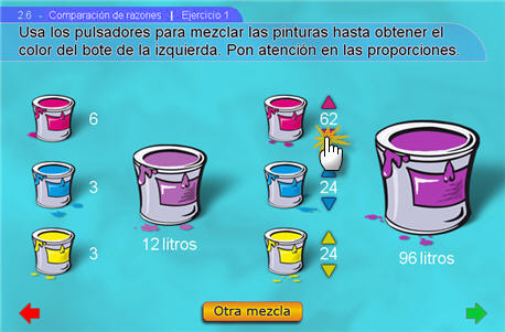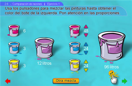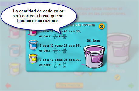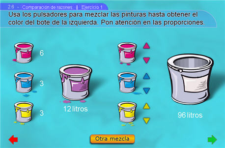 6. EjerciciosHaciendo uso de los conceptos aprendidos sobre razón y temas relacionados, se presenta una serie de problemas de aplicación, tales como triángulos equivalentes o de proporción de mezclas. Ejercicio 1La primera escena de este apartado muestra unas cubetas con pintura y la idea de este interactivo es que el niño observe que del lado izquierdo hay 4 cubetas, 3 con los colores primarios acompañadas de un número (indica la cantidad de litros que se aporta de ese color) y una cubeta un poco más grande con pintura dek color de la mezcla de los primarios, además de tener un texto en la parte inferior que indica cuantos litros de pintura hay en total en dicha cubeta (es la suma de los litros de los tres primarios). Del lado derecho se observa algo similar, con la diferencia que el bote está vacío y se requiere que se obtenga el número de litros que se encuentra debajo de la cubeta del extremo derecho, con una mezcla que de el mismo color que enla mezcla de la izquierda. Las pequeñas cubetas del lado derecho ofrecen la posibilidad de aportar litros de pintura de cada color, con ayuda de os pulsadores, presione cada uno de ellos para agregar o quitar llitros de pintura de cada color, hasta obtener la misma mezcla.