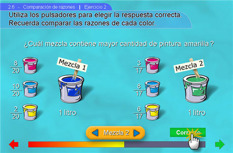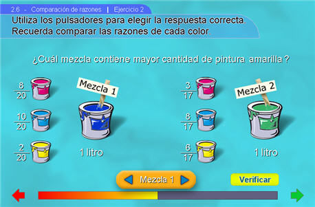 Ejercicio 2El siguiente es un ejercicio, en donde se requiere que haga comparación de razones para identificar si alguno de los tres colores primarios aporta más color en una mezcla o en otra. Se muestra una pregunta, para contestarla se debe comparar el aporte del color por el que se se pregunta, en el caso de la imagen es el color rojo, con ayuda de los pulsadores se debe elegir la mezcla que contenga más porcentaje de ese color