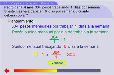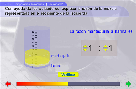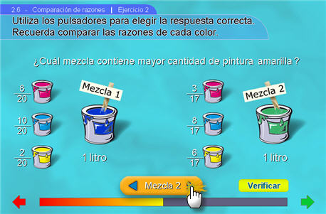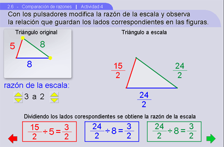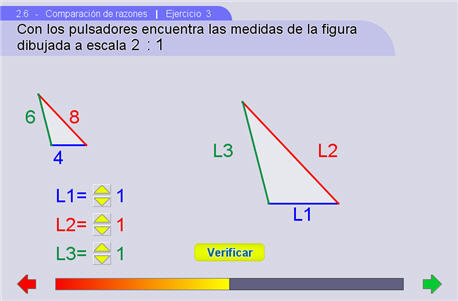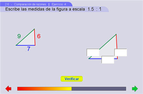 y presionar el botón Verificar Si se ha contestado correctamente se obtiene una nueva mezcla y se vuelve a preguntar. Ejercicio 3 y 4Los ejercicios 3 y 4 son una revisión de razones y su aplicación en dibujos a escala. En ellos se pide calcular los lados de un triángulo dibujado a escala respecto a otro de lados dados. En el ejercicio 2 se contesta por medio de los pulsadores y en el ejercicio 3 la respuesta se debe escribir en el campo de texto.
