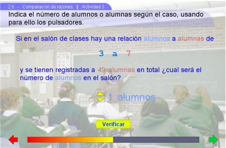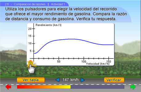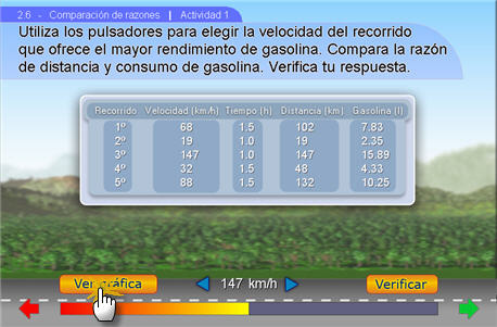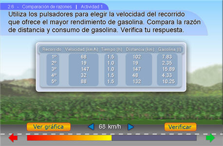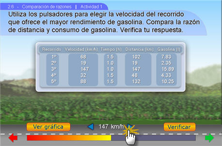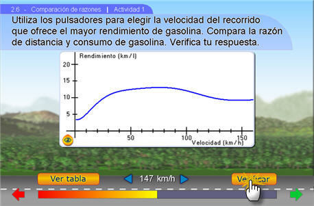 Cuando encuentre en que recorrido se obtuvo un mejor rendimiento (mayor número de km recorridos por litro de gasolina gastados) sabrá cuál es la velocidad que ofrece dicho rendimiento, utilice entonces los pulsadores para elegir esa velocidad en la parte inferior de la escena. Puede ver la gráfica del comportamiento del rendimiento del auto con el botón Ver gráfica Dentro del panel de la gráfica hay un botón con la forma de un ojo, dicho botón permite ver en que posición de la gráfica se encuentra el rendimiento en función de la velocidad del auto. Esta gráfica muestra el comportamiento de un auto en específico y este auto obtiene un mejor rendiemiento a los 76.5 km/h. Puede ir comparando las diferentes velocidades con los pulsadores usados previamente. Cuando este seguro de que ha encontrado la velocidad de mayor rendimiento en la tabla y/o con ayuda de la gráfica, presione el botón Verificar, si lo hace bien aparecerán datos nuevos. La siguiente escena muestra un contenedor translúcido conteniendo distintas cantidades de dos diferentes sustancias. El objetivo es representar, en la notación que se pide, la razón de ambas sustancias. La respuesta es verificada con el botón Verificar de la parte inferior y el avance es indicado por la barra de avance debajo del botón anterior. Actividad 2Actividad 3El siguiente ejercicio sugiere encontrar el número total de alumnos dentro de un salon de clases, teniendo como datos la relación alumnos a alumnas y el número total de éstas. El ejercicio es resuelto mediante una simple regla de tres y a cada acierto la barra de avance crece a la derecha, generando un nuevo planteamiento con distintos valores.