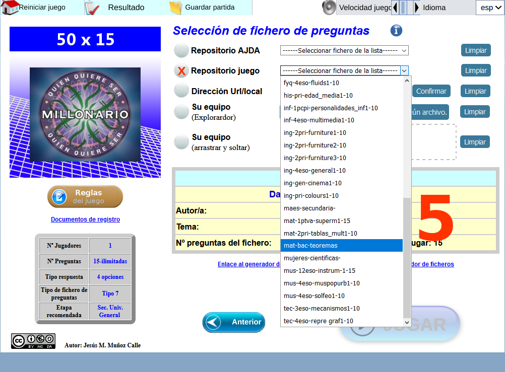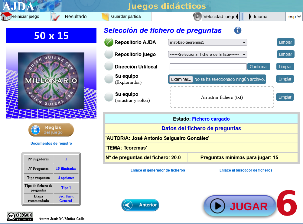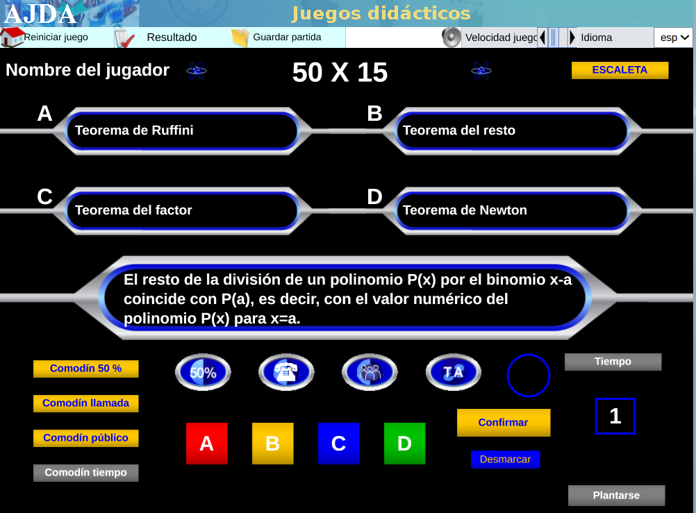 Como el fin de RED Descartes es promover la renovación y cambio metodológico en los procesos de aprendizaje y enseñanza de las Matemáticas, y también en otras áreas de conocimiento, utilizando los recursos digitales interactivos generados con la herramienta de autor Descartes JS, hemos elaborado un juego didáctico basado en las matemáticas y sus teoremas, con una selección de veinte, la gran mayoría tratados y presentes en los diseños curriculares de esta materia en las etapas de educación secundaria obligatoria y bachillerato, aunque cada jugada dispone de quince preguntas con el formato del tradicional 50X15, ideal para presentarlo en la PDI del aula y organizar un par de equipos, con la posibilidad de buscar información, en caso de necesidad, en los dispositivos móviles del alumnado o el equipo tecnológico del espacio utilizado.