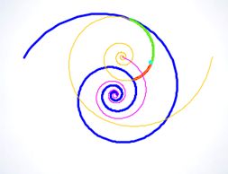 Fig. 2. Espiral que aproxima perfil de la concha (azul), la de los septos (amarilla) y la que describe el polo de los arcos septales (magenta). |