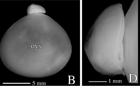 Fig. 6. Embrión de 4 meses del Nautilus pompilius. Imagen B: Perfil con el saco vitelino exterior (oys: outer yolk sac). Imagen D: Detalle de la concha embrionaria. (Procedente de Sasaki, et al., 2010).