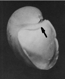 Fig. 9. Labio dorsal (señalado por la flecha) en la concha del Nautilus en la fase de dos cámaras. (Procedente de Landmam et al.1989). |