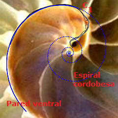 La constricción de la cicatriz, coincidente con la intersección de la concha embrionaria con el primer septo, es la que marca el inicio del patrón de crecimiento correspondiente a la sección de la concha ventral. A partir de la imagen correspondiente a la fase del primer septo (ver Fig. 16) podemos observar claramente la curvatura de la parte ventral y verificar cómo ésta se ajusta a una espiral cordobesa, ajuste que permanece durante toda la vida del animal (Fig. 17). Consecuentemente, ésta es una característica intrínseca y permanente, un segundo invariante, en toda la ontogenia del Nautilus desde el periodo embrionario septal a la madurez.