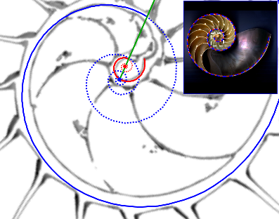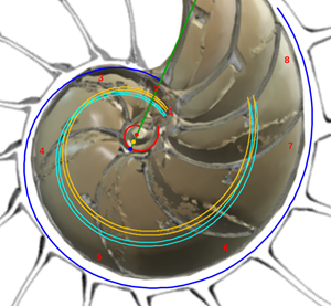 Ambas espirales comparten el mismo eje polar (en color verde en la escena), es decir, el eje de cada una de ellas está incluido en la semirrecta que pasa por el polo ventral y por el polo dorsal. Adicionalmente, esta semirrecta interseca a la concha en la constricción dorsal y la ventral que son los puntos de intersección y tangencia, respectivamente, del primer septo con la pared dorsal y la ventral de dicha concha. Esto cuadra con la ontogenia biológica descrita antes y matemáticamente aporta también una pauta común de crecimiento al compartir ambas espirales el mismo parámetro angular. El ángulo inicial común para ambas espirales indicamos que lo denotaríamos como θi y entonces el recorrido total de la espiral dorsal termina en