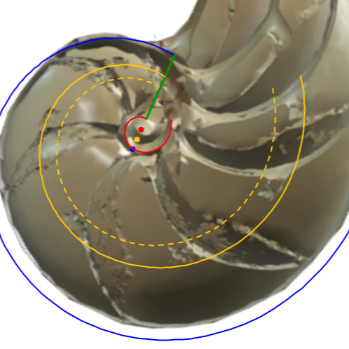 [2] De nuevo, hemos de recordar que el paso de la yocto-yotta realidad al modelo teórico requiere de la consideración de cierta tolerancia, pero que hay que saber distinguirla de la existencia de una diferencia que provoque cambios en el modelo. Si la toma en consideración de esa tolerancia no cambia el modelo podremos aceptarla y admitirla, pero habrá que evitarla cuando se provoque un cambio en él. Así pues, en este caso es obligado considerar que los polos son diferentes. Por el contrario, por ejemplo, en las espirales que hemos considerado para ajustar el perfil del labio dorsal y de la pared ventral, en especial ésta, podría aducirse que necesitarían una mejora en su ajuste a la imagen de la concha en ese primer verticilo, pero realmente no es necesario ya que tal y como se ha considerado es suficientemente adecuado para determinar el modelo global que caracteriza al genus Nautilus. Esto ya lo mostramos en la fig. 21, y lo detallamos ahora, pues al observar el ajuste de la pared ventral (espiral azul) en el primer verticilo y su ajuste global en la toda la concha, se marca de manera evidente que la tolerancia considerada es admisible para determinar el modelo a nivel tanto local como global (el grosor de la pared es inferior a un mm, lo puede medir en la escena y el ejemplar considerado tiene unos 143 mm en su etapa adulta, figuras 22 y 23) . Sin embargo, si modificásemos la posición del polo de la pared dorsal, es decir, ignorásemos la pequeña distancia que existe entre ambos polos obtendríamos variaciones no admisibles a nivel local, es decir, cambiaría el modelo y no se ajustaría a la ontogenia del Nautilus.