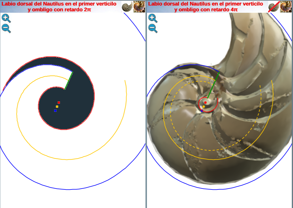 Geométricamente, si el labio dorsal en el primer verticilo tuviera sólo el retardo de 2π se generaría un ombligo de mayor tamaño al que se observa en la concha del Nautilus. Esto representaría al animal un esfuerzo constructivo mayor, pues tendría que cubrir una superficie más amplia (en este caso más longitud dado que estamos trabajando con la sección) ya que este labio dorsal bordearía a la concha embrionaria. En la escena interactiva 3, espacio izquierdo, puede verse cuál sería la forma del labio dorsal, ombligo y concha en el supuesto de un retardo de 2π y en el espacio derecho el caso de retardo 4π. Entre las dos alternativas la correspondiente a 4π parece la más eficiente. Podrían plantearse retardos que no tuvieran que ser múltiplos de 2π, pero de partida ello no se observa como biológicamente adecuado, pues estaría considerándose que la parte dorsal del cuerpo del animal tendría un crecimiento descompensado, al menos en algún instante o periodo temporal, respecto a la ventral. Pudiera acontecer, pero el deslizamiento que realiza a lo largo del fragmacono al crecer, inspira más una situación más regular. Si en el periodo evolutivo acontecido en la larga historia de este animal han ocurrido retardos de otro tipo, al menos parece que la selección natural ha conducido al retardo de 4π que hemos detectado y que consideramos en nuestro modelo del primer verticilo.