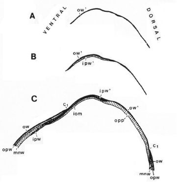 | Fig. 15. Perfil de la concha embrionaria o preseptal | Fig. 16. Ajuste de la pared ventral en la fase del primer septo. C1: Constricción |
