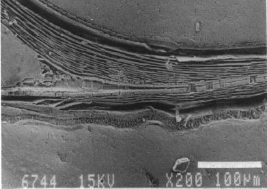 Fig. 18. Detalle de la unión del segundo septo y la parte ventral de la concha en la fase de dos cámaras. Ampliación de la imagen de la Fig. 13. Entre ambas paredes en la parte apical se observa un cemento de unión. (Procedente de Landmam et al.1989).