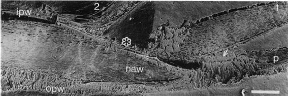 Fig. 19. Detalle de la unión de los dos primeros septos (1 y 2) y la parte dorsal de la concha en la fase de dos cámaras. Ampliación de la imagen de la Fig. 13. Entre ambas paredes se observa un cemento de unión. (Procedente de Landmam et al.1989).