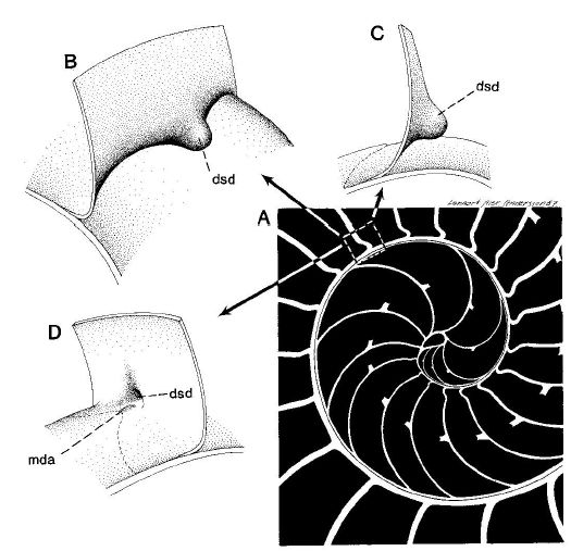 Fig. 20. Sección de la concha del Nautilus. Diferentes vistas de la depresión septal dorsal (dsd) en el área dorsal media (mda). (Procedente de Mutvei & Doguzhaeva, L. 1997).