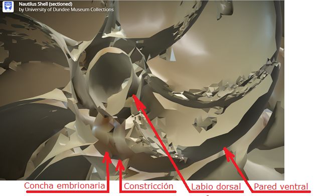 Escena interactiva 2. Concha y sifúnculo del Nautilus en el primer verticilo.